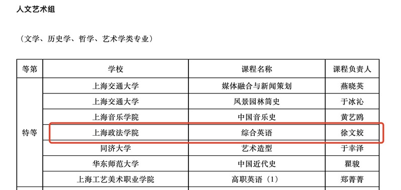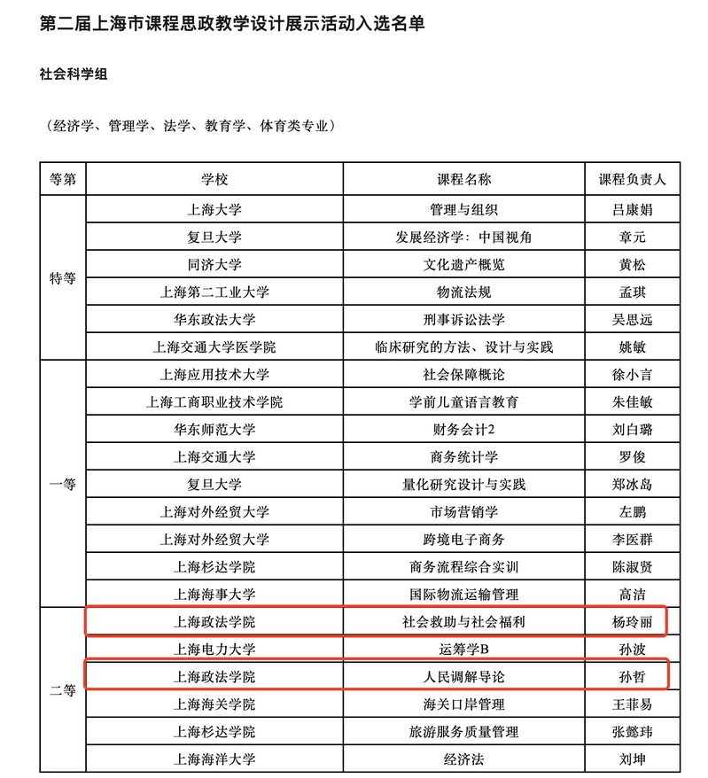近日,上海市教委公布了第二届上海市课程思政教学设计展示活动入选名单,我校推荐申报的三门课程全部斩获奖项,获奖率100%:语言文化学院徐文姣老师负责的《综合英语》获人文艺术组特等奖,政府管理学院杨玲丽老师负责的《社会救助与社会福利》和法律学院孙哲老师负责的《人民调解导论》分别获社会科学组二等奖。