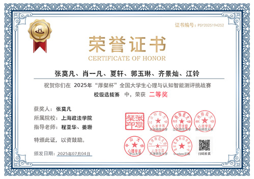 近日,在第三届全国大学生心理与行为在线实验精英赛中,我院心理学专业组建的参赛队伍,依托学院重点建设的心理学学科优势,凭借扎实的专业基础、贴合社会治理场景的实验设计与高效的团队协作,从省内外众多参赛队伍中脱颖而出,荣获一等奖,成功晋级分区赛。