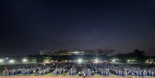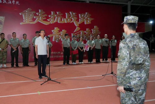 18时45分,行军拉练誓师大会于学校田径场举行。全体参训学生集合完毕,目光如炬,脊梁如松,整装待发。在动员讲话中,武装保卫部(处)长、学生军训团副团长潘高荣号召同学们“拿出政法学子的勇气,亮出青春奋斗的锋芒,用脚步丈量征程,用热血书写篇章——让这段夜训路,成为终生难忘的奋斗史诗!”在场学生随后用气势磅礴、各显特色的誓言,发出了最动听的“回应”,表达了最坚定的决心。