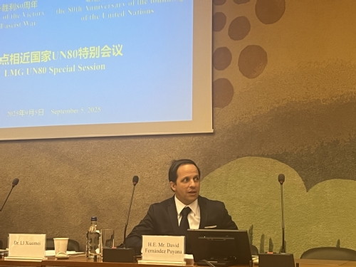 9月5日,由中国常驻日内瓦代表团主办的观点相近国家联合国成立80周年特别会议暨纪念世界反法西斯战争胜利80周年主题研讨会在瑞士日内瓦万国宫举行。我校“尚合学者”、中国—上海合作组织国际司法交流合作培训基地办公室(以下简称“中国—上合司法培训基地办公室”)日内瓦中心主任大卫·费尔南德斯·普亚纳(David Fernández Puyana)以联合国和平大学驻日内瓦办事处大使兼常驻观察员身份应邀参会并发表讲话。