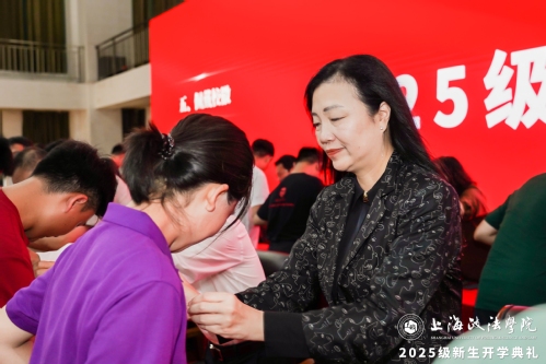 在开学典礼的佩戴校徽仪式上,伴随“新利18官方客服之歌”的旋律,主席台全体领导为新生代表佩戴校徽,其他同学自行或相互佩戴校徽。当校徽稳稳别在胸前,新一代“上政人”将弘扬“刻苦求实、开拓创新”的校训精神,砥砺强国理想,贡献青春作为,让胸前的校徽在逐梦征程中熠熠生辉。