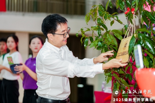 校党委书记葛卫华与新生代表一同为“新生树”浇灌滋养之水,悬挂纪念铭牌,他深情寄语同学们:“愿你们如这棵生机勃勃的新生树一般,向下扎根,在上政深厚的学术沃土中积淀学识、锤炼品格;向上生长,以年轻人的姿态拥抱时代、实现理想。”典礼结束后,这棵凝聚着希望与承诺的树苗将以“时光胶囊”数字化成长档案的形式,成为2025级全体新生大学时光中最忠实的伴随者、见证者、守望者。