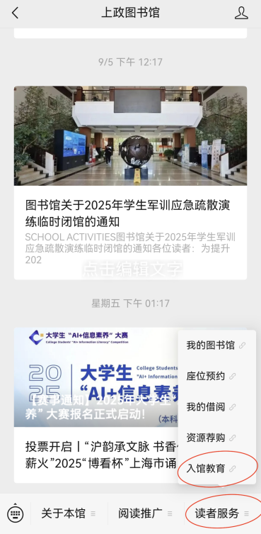 1.进入微信搜索公众号“上政图书馆”,点击关注,进入上政图书馆公众号,点击“读者服务-入馆教育”。