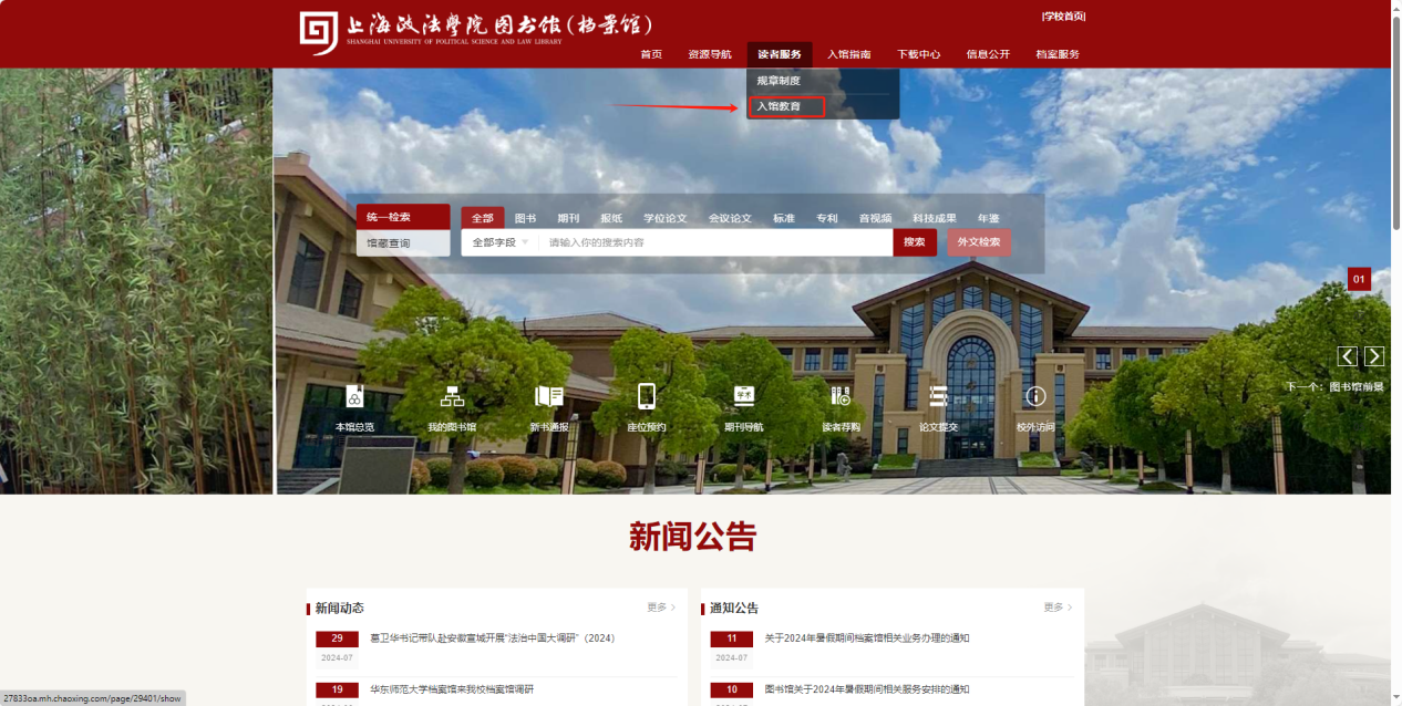 3.图书馆主页导航栏→读者服务→入馆教育。