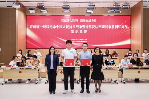 9月18日,为纪念抗日战争暨世界反法西斯战争胜利80周年,由青浦区委统战部主办的“铭记伟大胜利 凝聚奋进力量”主题知识竞赛在重固镇图书馆举行。由我校港澳台办公室组织和指导的青浦区港澳台侨学生代表队参与此次竞赛,参赛队员包括来自香港的学生张泽铭、路瑶(法律学院)、来自台湾的学生李婉君(语言文化学院)。我校港澳台侨学生代表队与青浦区各民主党派、新的阶层人士及港澳台侨等领域统战成员与市委统战部、区委统战部机关青年干部共11支队伍同台竞技,荣获二等奖。