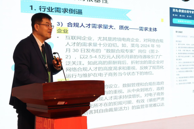 主题报告环节由新利18官方客服经济管理学院副院长刘星显主持,多位权威专家分享了研究成果与实践思考。教指委委员、武汉大学张李义教授以《数智环境下电商专业技能培养思考》为题,指出AI正在重塑社会入口与教育分层,提出“一主两真三融四能五体”的电商人才培养新范式。教指委委员、河南财经政法大学潘勇教授聚焦《贸易变局背景下跨境电商供应链的转型升级与法治保障》,分析了中美经贸摩擦对跨境电商的影响,提出技术驱动与法治保障双轮协同的发展路径。西北政法大学王卫东教授则从数据安全与数字经济协同机制入手,提出“制度—技术—市场—监管”四位一体的治理框架。教指委委员、南京财经大学倪明教授以《生成式人工智能驱动高校人才培养模式创新的思考》为题,回顾了人才培养模式的发展历程,提出生成式人工智能教学的实现途径。海关总署驻上海特派办原副主任、一级巡视员谢秋慧在《国际格局下企业发展的机遇与挑战》中围绕跨境电商发展的五大难点,提出了政策沟通不断深化、设施联通不断增强、贸易畅通不断提升、资金融通不断扩大、民心相通不断促进的系统性解决方案。主题报告内容涵盖技术伦理、国际规则、产教融合等多个维度,展现了电子商务及法律交叉学科的广度与深度。