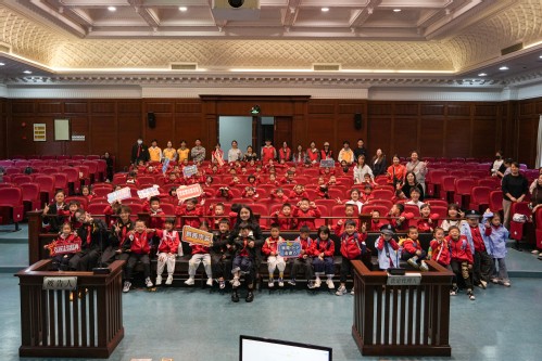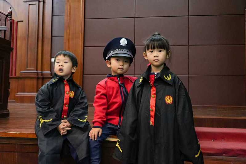 在明法苑B4模拟法庭,学生志愿者按照剧本演绎关于防拐骗的模拟庭审,引导儿童感受法律的严肃性与安全性,培养规则意识与自我保护能力。在互动环节中,儿童们通过多种形式成为“法治小主人”,有的亲身扮演法官角色,敲法槌感受法律威严;有的参与“交通规则大冒险”,根据红绿信号灯指示模拟过马路,齐声跟读安全口诀;还有的在“防拐骗情景模拟”中,果断拒绝“陌生人”的诱惑,学会自我保护。整个过程中,现场志愿者耐心讲解、全程护航,让法治意识深入人心。