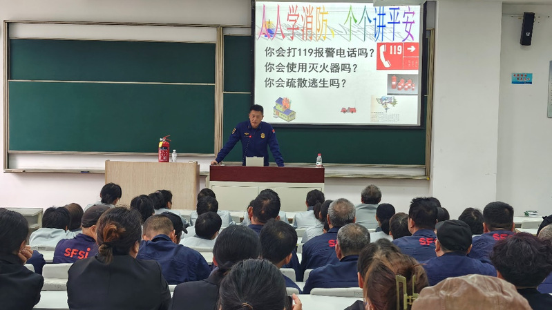 讲座中,汤站长以“人人学消防、个个讲平安”开题,围绕“如何拨打‘119’火警电话、怎样正确使用灭火器、 火灾发生后怎样安全疏散逃生”三个层次进行理论和实操授课。他结合生活场景讲解消防安全知识,现场播放学生宿舍楼火灾案例视频,直观展现高校学生宿舍、食堂、实验室等公共场所发生火灾的实际情况,让大家认清“小隐患、大危害”。随后,汤站长重点传授了报警电话的正确拨打、灭火器的使用方法及火灾疏散逃生等方面实操方法,引导师生员工牢固树立“全民消防、生命至上”的安全理念。