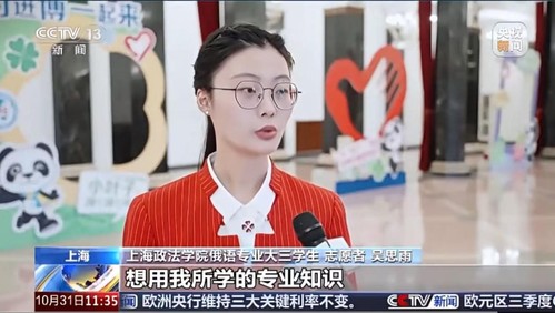 此外,来自学院23级俄语专业的二年级“小叶子”吴思雨则讲述了自己以专业所长助力盛会的实践故事,接受了央视新闻和上海教育电视台采访。