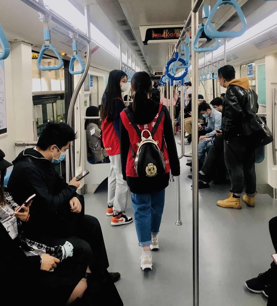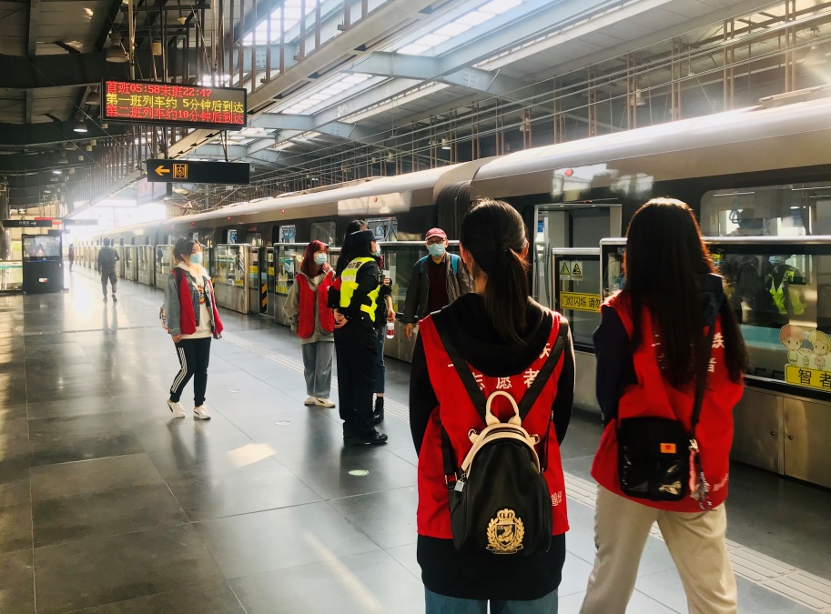 志愿者各司其职,井然有序。跟随警方的脚步,分别进行两项任务:在车厢内提醒乘客带好口罩、遵守乘车规章制度;在站台外协助警方巡视是否有贩卖等违规行为并进行劝导。在长达四小时的志愿服务期间,志愿者们认真履行自己的职责。与乘客及商贩等耐心沟通,充分展现了青年一代的责任感和使命感,为确保地铁的正常运行及乘客们的安全贡献一份力量