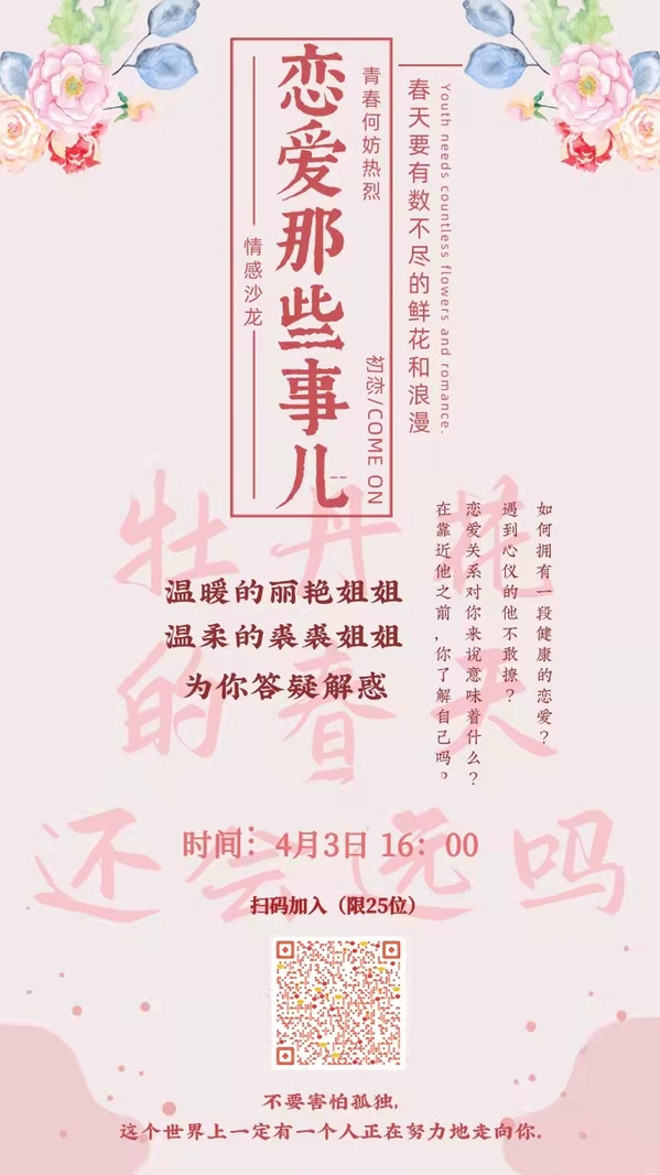 43日,在学校准封闭管理期间,党总支副书记张丽艳和辅导员裘欣璐开展“春日·心灵有约”活动,对于女大学生开展爱情、亲情和友情的教育引导,与学生进行心贴心的交流。44日,全校进行片区化管理,学生“足不出楼”,活动以线上的形式延续。