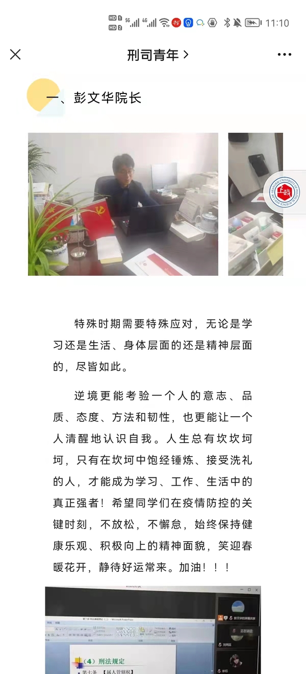 刑事司法学院加强对新媒体宣传的学生进行线上培训,提高宣传战斗力。统筹依托“刑司青年”微信公众号和视频号发布一系列的线上抗击疫情专题活动,牢牢把握网络空间的主动权,传递网络正能量,例如发起抗“疫”主题征文活动、开启“云空间”创始人、发布“线上教学师生采访”、“榜样力量·考研专辑”等系列活动,加强网络阵地建设。