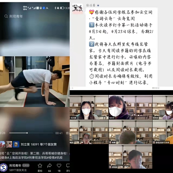 3月29日起,学院依托“刑司青年”平台,开设“刑司运动‘云空间’”,发布“刑司小哥哥喊你来健身”系列视频,号召同学健身打卡。同时通过学生社群,开展“云舟览读”读书打卡活动和“学习云打卡”活动,开设云上“自习室”,每日由小组长负责,进行自习活动。