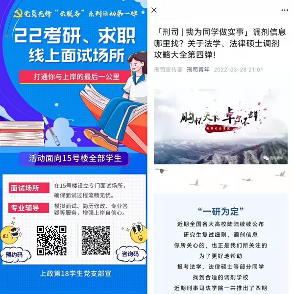 3月25日起,在刑事司法学院团委学生会的牵头下,同学们搜集了“100所高校关于法学、法律硕士调剂信息”,并通过“刑司青年”发布,希望通过朋辈互助的形式助力毕业生一“研”为定。