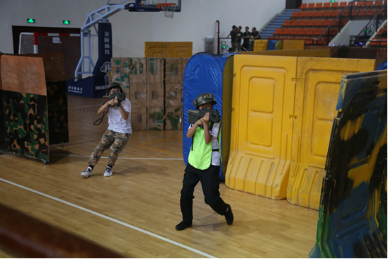 伴随着尖锐的哨声,比赛正式开始。我校队员们灵巧的身影穿梭在掩体中,清冽的枪声回响在比赛馆中,各位队员及时地给予队友提示,为最终的胜利扫清障碍。举枪瞄准、观察四周、扣动扳机、侧身躲避,这已经不仅仅是体力上的消耗,更是一场智慧的拼搏。