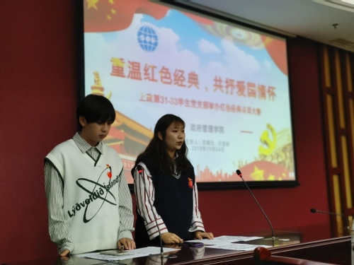 在“不忘初心、牢记使命”主题教育的引领下,在新中国成立70周年的壮丽背景下,10月24日下午,政府管理学院第31、32、33学生党支部“重温红色经典,共抒爱国情怀”红色诗词大赛暨党日活动在综合研究中心107举行。校党委副书记刘刚,学院党总支书记连淑芳,学生工作部副部长柯心,学院党总支副书记闯晓燕等出席了活动。