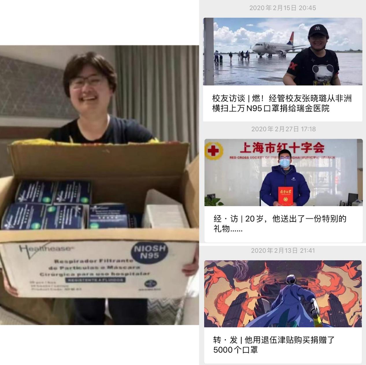 抗击疫情期间,学院青年学子用实际行动诠释责任担当。用退伍津贴购买了5000只口罩捐赠社区的退伍学生郭铖宋、积极联络香港友人收集口罩捐赠回国内并参与志愿活动的程泳棋、20岁生日当天将收到的红包和积蓄共5000元捐献上海市红十字会的宓彦闻、辗转从海外购买运送14420只N95口罩带回国内捐赠瑞金医院的学院校友张晓璐……一件件平凡而充满力量的“小事”令人感动,经管学子用实际行动坚定了抗“疫”必胜的信心。学院团委积极引导、深入挖掘、宣传采访,在微信公众平台报道他们的抗“疫”事迹,为广大青年学子树立青春榜样。