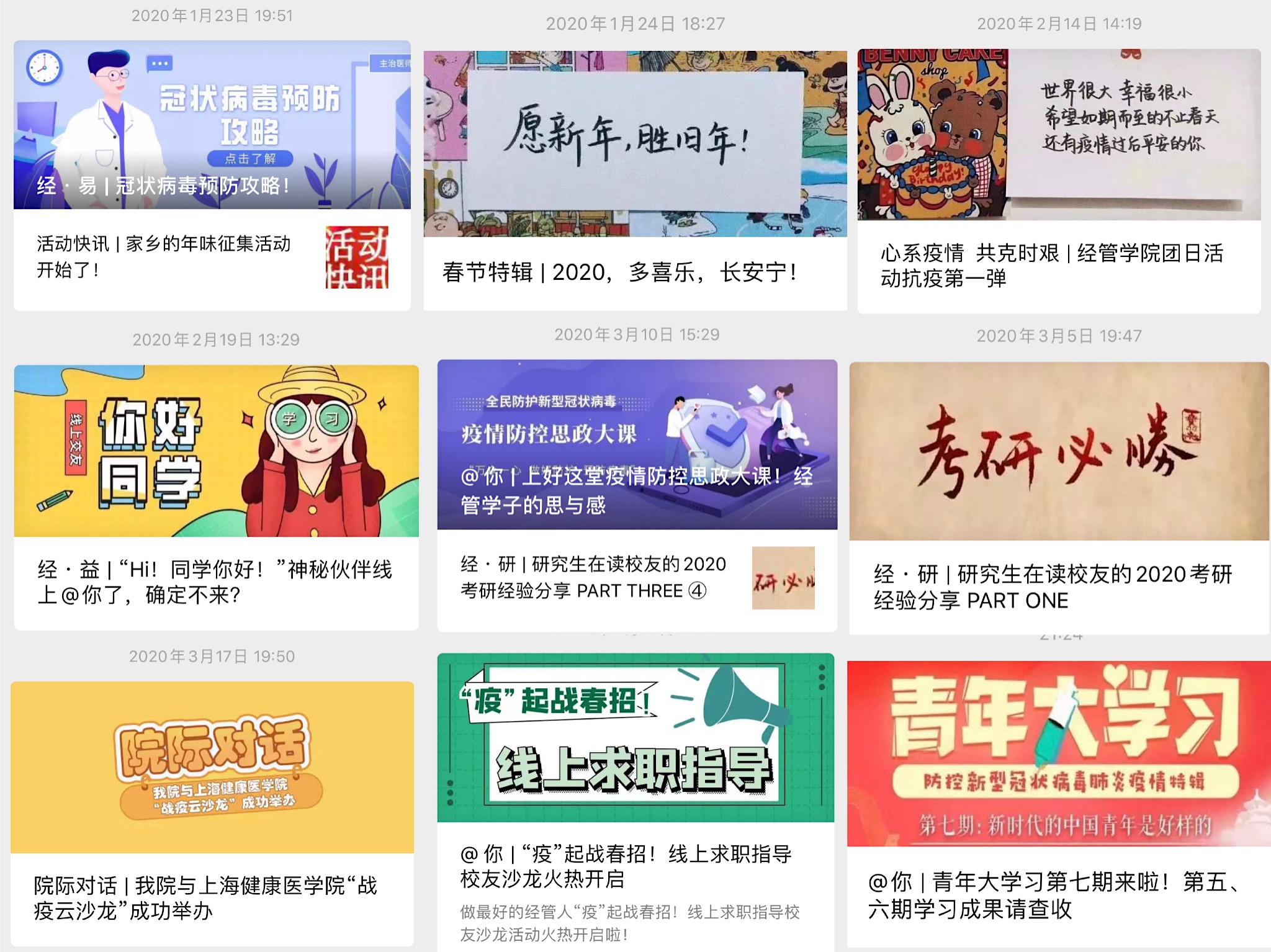 新冠疫情发生以来,经济管理学院分团委积极发挥共青团组织作用,强化宣传引导,坚定抗疫决心,开展了一系列线上主题活动,凝“青”聚力,为打赢这场疫情防控战贡献青春力量。