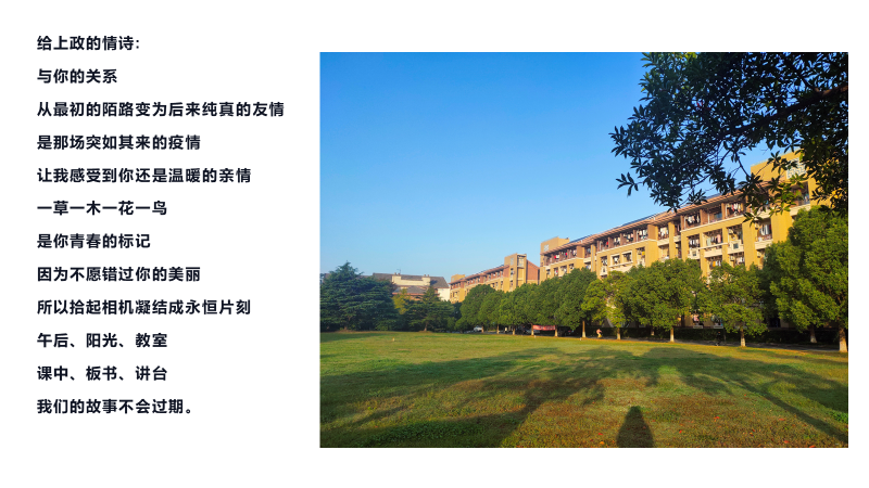 经历了突如其来的疫情,当我们九月再度回到阔别已久的校园,一切陌生而又熟悉,为了纪念这段特殊的日子,上政阅读协会精心策划、举办了“寻找上政最美的风景”摄影比赛,并附上三行写给上政的“情诗”。大家一起找寻上政最美丽的那道风景线,让我们更加熟悉、热爱我们美丽的校园。
