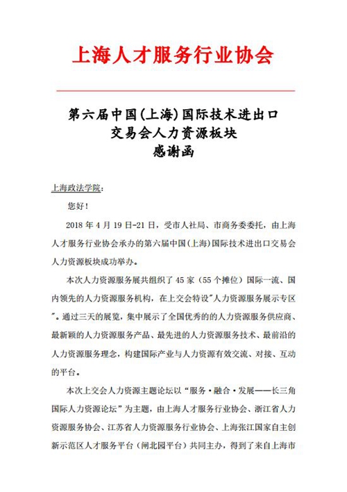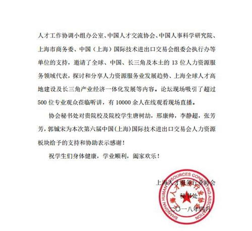 4月26日,我校收到了上海人才服务行业协会的感谢信,对我校志愿者唐树劼、邢康帅、李静超、张芳芳、郭铖宋在第六届中国(上海)国际技术进出口交易会国际人力资源主题论坛中细致周密、认真负责的工作态度表示肯定,对志愿者们无私奉献的志愿服务精神表示感谢。
