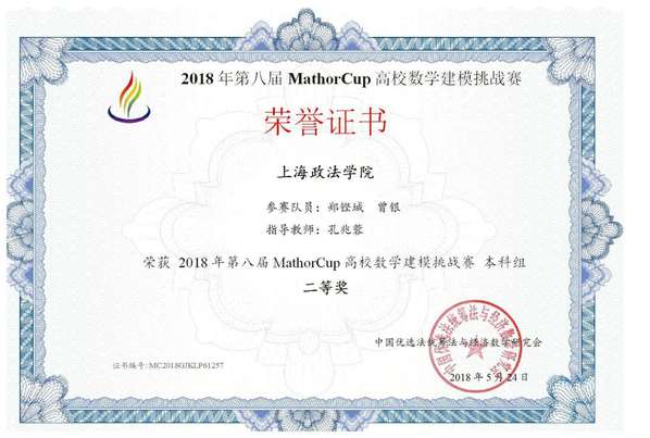 近日,第八届“MathorCup高校数学建模挑战赛”与第十一届“‘认证杯’数学中国建模比赛暨2018年全球数学建模能力认证赛”获奖名单公布,我校学生在两项比赛中获得佳绩:MathorCup挑战赛荣获全国二等奖,‘认证杯’建模比赛第一阶段荣获全国一等奖。指导教师为我校经济管理学院教师何怀玉和孔兆蓉。两个比赛的参赛队员均来自经济管理学院,由经济管理学院郑铿城担任队长,其中:MathorCup获奖队伍由郑铿城和曾银参加,认证杯获奖队伍由郑铿城和赵文参加。