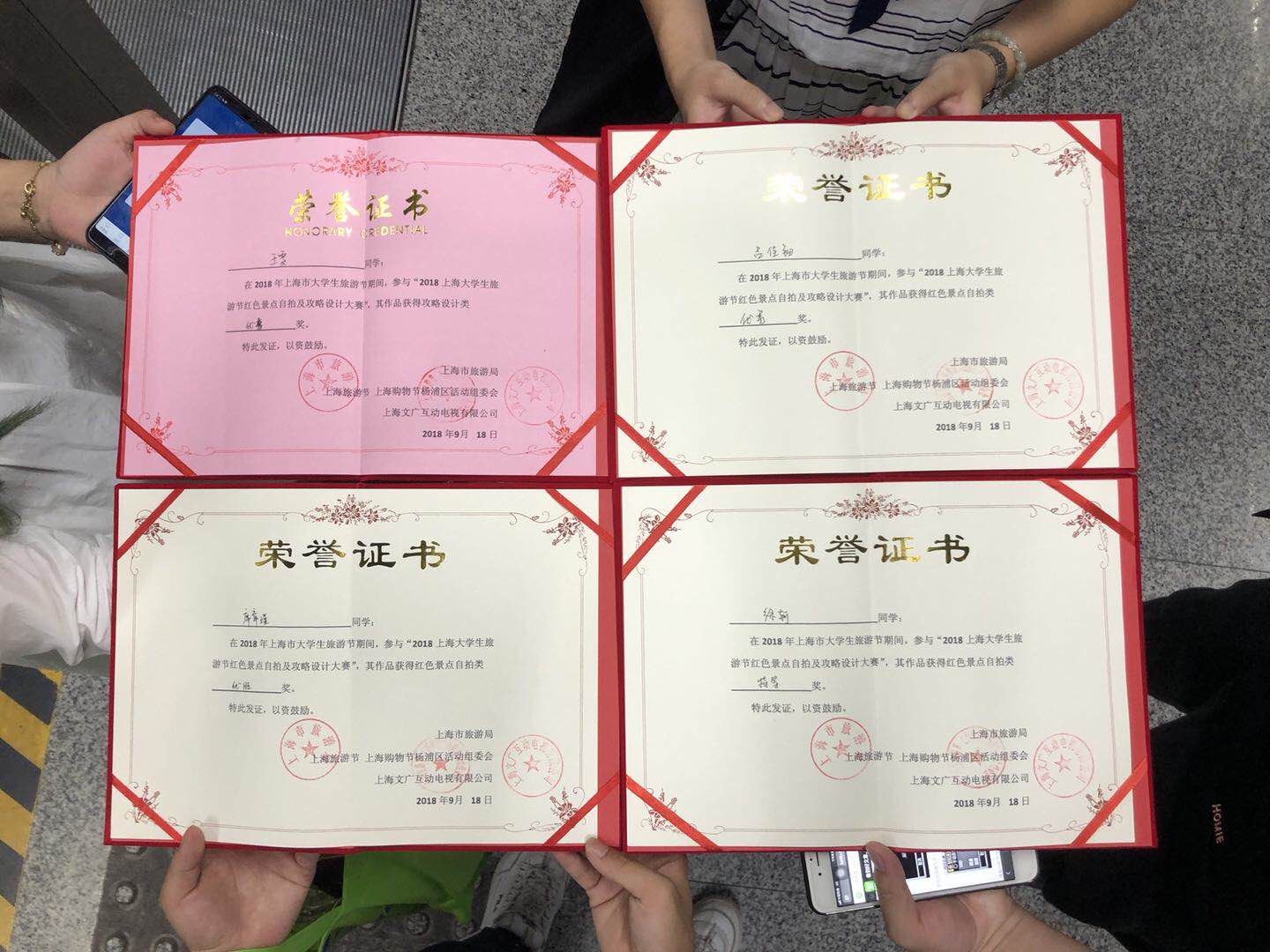 由上海市旅游局、杨浦区人民政府主办的2018上海大学生旅游节红色自拍及攻略设计大赛于9月21日晚在黄兴公园中央广场举行颁奖典礼和展映仪式。我校上海纪录片学院徐轲、席章瑾、廖明明、李嘉诚、吕佳钿、王雯等同学参加并获奖。