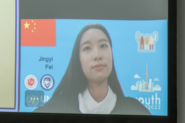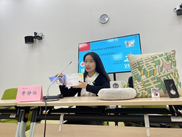 228日晚8时,于中国-上海合作组织国际司法交流合作培训基地中,费静怡连线联合国毒罪办,为中国禁毒事业发出青年声音。