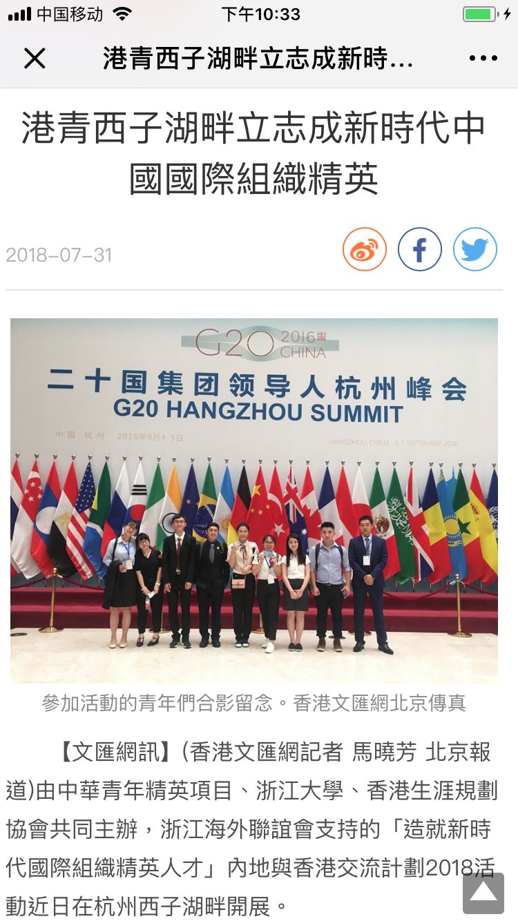 “西子湖畔阳似火,述江南画廊江天;求是园里集群智,塑良材天下来同。”2018年7月20日至7月28日,来自香港各高校、浙江大学与内地其它高校的百名青年才俊齐聚“造就新时代国际组织精英人才”2018内地与香港交流计划。在九天的交流活动中,成员们的足迹遍及浙沪辖下三地:十余场精彩的大师讲座、群策协力的创新工坊、江南风光的游历饱览、国际议题的接触认知,“仲夏育英才”,在浸入式的体验与开放式的交流中,成员们全方位、多角度地感知了活动的主题,为未来投身于国际治理迈出了坚实的一步。
