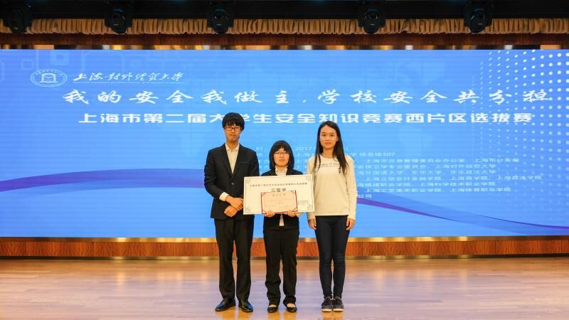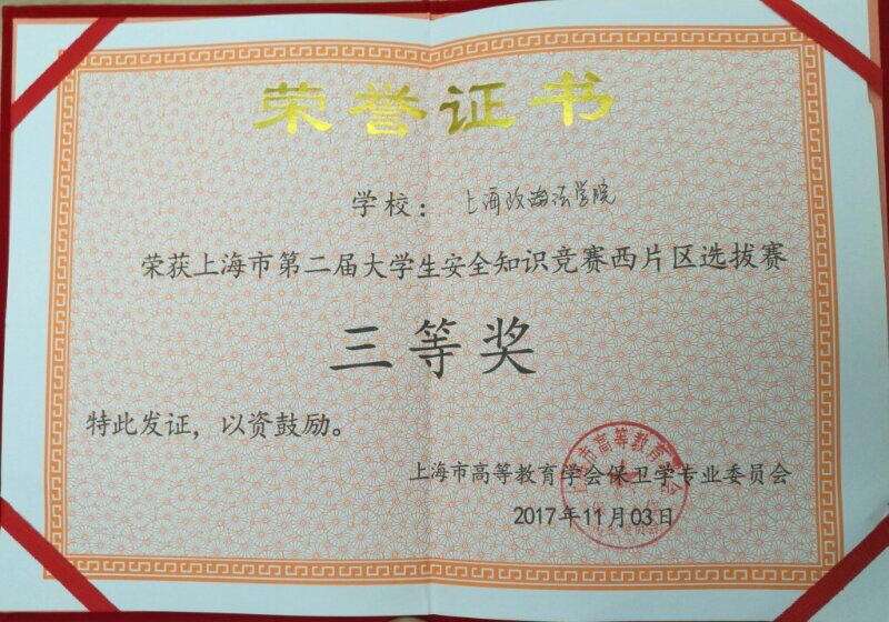11月3日,上海市第二届大学生安全知识竞赛西片区选拔赛于上海对外经贸大学举行。我校与华东师范大学、上海外国语大学等14支参赛队参与了西片区的比赛。最终,我校名列第五,荣获上海市第二届大学生安全知识竞赛西片区三等奖。