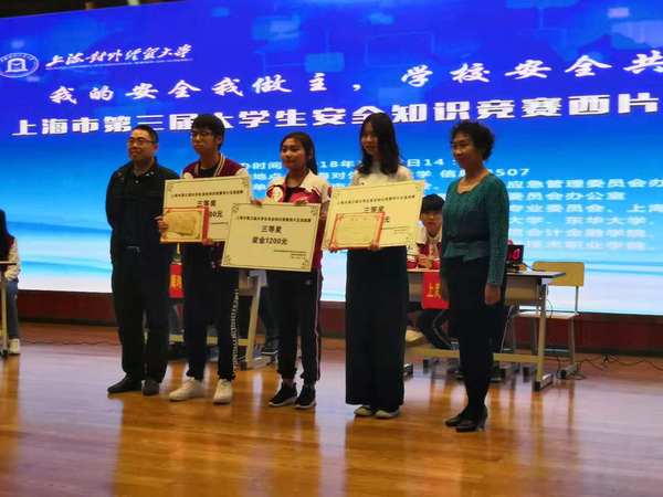 11月2日,上海市第三届大学生安全知识竞赛西片区选拔赛在上海对外经贸大学如期举行。由我校刑事司法学院、经济法学院和社会管理学院的张富、张晓敏、任珂、邢浦青、龚天琪五名同学组成的新利18官方客服代表队在此次比赛中取得佳绩,荣获三等奖。