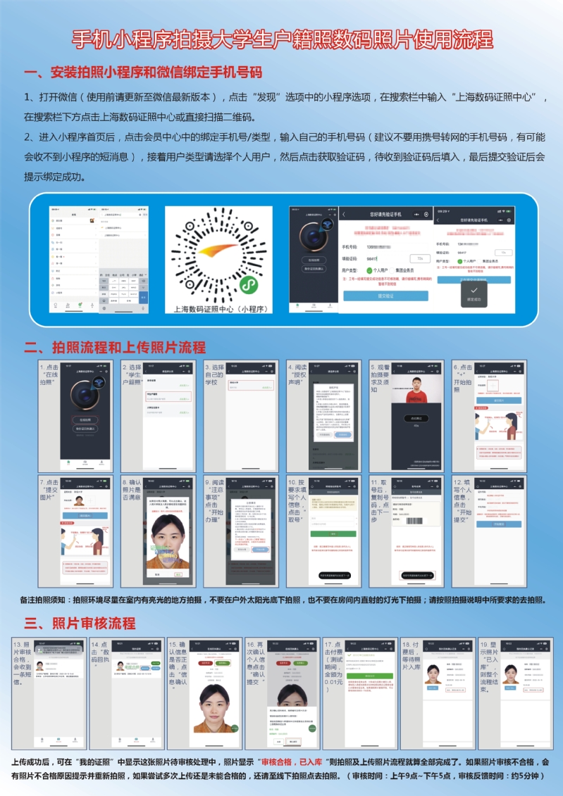 根据公安机关户籍管理政策的相关规定,申报户口迁入学校集体户的新生必须采集照片信息才能完成落户。经与青浦区夏阳派出所协调,今年新生户口申报集中拍照改为通过微信小程序自助拍照,具体事宜通知如下: