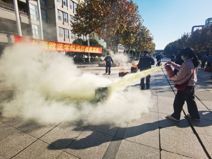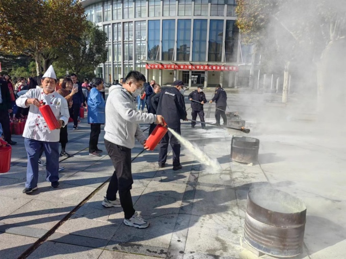 讲座结束后,全体人员前往庸夫广场前进行现场灭火演练。演练前,学校消防站负责人首先示范了使用灭火器的方法,以及掌握灭火时的技巧,组织全体人员现场模拟使用灭火器进行火灾扑救,师生们个个踊跃参与,纷纷按照正确的操作方法提起灭火器并成功进行灭火。
