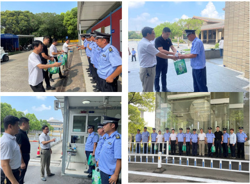 保卫处处长潘高荣和上海五蕴保安公司副总经理范保山、区域经理张欢欢等为暑假期间战高温斗酷暑、值守在校园安保一线、认真履职尽责守护校园安全的各岗位安保值守人员送上了清凉和慰问。保安公司领导详细询问了解了暑假安保值守、校园安全守护、员工身心健康、迎新工作准备等方面的情况,就做好暑假后期校园安全工作提出了具体工作措施,保卫处就认真做好迎新准备、强化校园安全管理、做好安保服务保障等工作提出了要求。