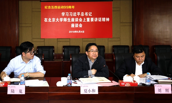 学校要闻 5月4日上午,我校在求实楼413会议室举行学习习近平总书记在北京大学座谈会上重要讲话精神座谈会,校党委书记夏小和,校党委副书记、副校长刘刚出席座谈会,学校各职能部门二十多名青年教师参加会议,会议由校团委书记陆嵬主持。