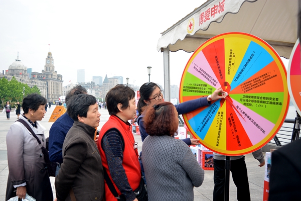 校红会副秘书长、团委副书记朱慧博,校禁毒研究中心主任金翼翔博士以及禁毒志愿者代表参加展示。在黄浦江畔的徐徐微风中,游客们汇聚在展示位前,转动防艾知识转盘,志愿者们以寓教于乐的互动形式传播红十字精神和文化,回答问题正确的游客获得了我校志愿者创制的《团团历险记》绘本等纪念品,各种文创产品获得热烈欢迎,供不应求。