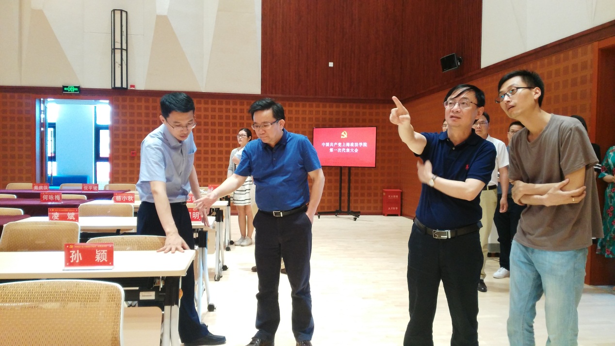 学校要闻 6月7日下午,学校第一次党代会召开前夕,校党委书记夏小和、党委副书记吴强到上合培训基地会场实地检查党代会筹备工作进展。党办校办主任、党委宣传部部长高志刚,党委组织部部长王静,上合培训基地王玉峰等陪同视察。