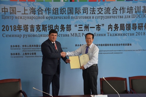 在上合青岛峰会胜利召开之际,塔吉克斯坦内务部“三州一市”内务局领导研修班结业典礼在新利18官方客服顺利举行。新利18官方客服副校长关保英,塔吉克斯坦代表团团长绍基尔佐达·巴赫龙,中国-上海合作组织国际司法交流合作培训基地(简称“培训基地”)培训部主任陈校和塔方学员共同出席结业典礼。典礼由培训基地培训部副主任印晓慧主持。