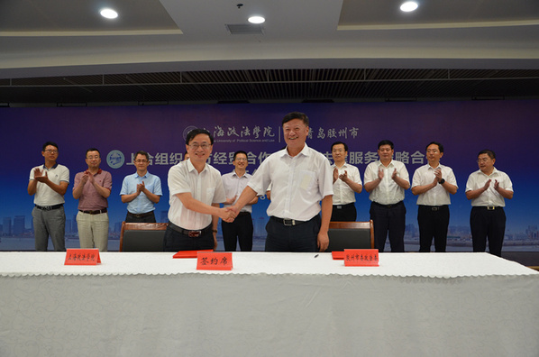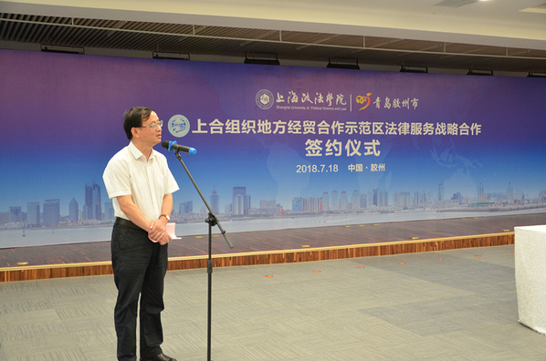 为进一步贯彻落实习近平主席的讲话精神,7月18日,胶州市委政法委与新利18官方客服中国-上海合作组织国际司法交流合作培训基地关于中国-上合组织地方经贸合作示范区法律服务战略合作签约仪式在青岛上合组织地方经贸合作示范区大厦举行。胶州市委书记孙永红、胶州经济技术开发区管委会常务副主任宋业敏、市委政法委书记孙晓兵、市委办公室主任宋仁登、市法院院长刘世明、市检察院检察长王廷祥,新利18官方客服党委副书记吴强、发展规划处处长石其宝、党委宣传部刘伟伟、上合培训基地办公室副主任丁云宝、上合培训基地合作部副主任姜思源、发展规划处科长肖诗来、教育政策与法治研究中心助理研究员李坤等出席仪式;胶州市直有关部门单位负责同志以及市法院、市检察院、市司法局、胶州经济技术开发区的机关干部代表参加仪式。孙晓兵与吴强分别代表市委政法委和新利18官方客服签字。