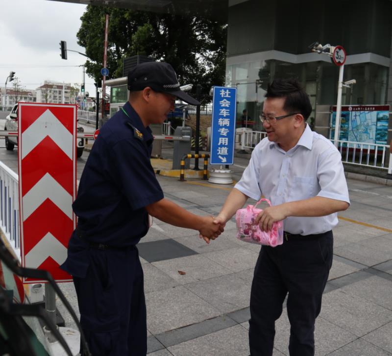 校领导先后走访了学生食堂、学生公寓、校园维修现场、上合基地和保安值班岗点,对工作人员和物业人员表达了亲切的问候。校领导对一线员工顶酷暑、战高温、御台风、不辞辛劳的工作态度给予了高度赞扬,感谢大家为确保校园安全运行所做的贡献。每到一处,校领导都与在岗员工一一握手并亲切交谈,详细询问暑期工作情况,并再三叮嘱大家要在做好安全生产的前提下注意防暑降温,做好防汛防台工作,保护好身体。