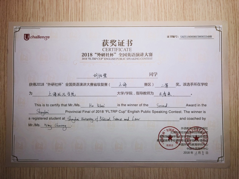 胡怡慧的演讲内容充实、具有感染力,她流畅的表达和纯正的发音得到了评委们的一致好评。在即兴问答环节,她的沉着冷静和流利诙谐的自由陈述给评委和观众留下了深刻印象。最终,在参赛的26名选手中获得二等奖,为学校争得了荣誉。备赛期间,我校外国语学院王春荣老师对胡怡慧给予了悉心指导,学院领导也给予了大力支持和亲切关怀。