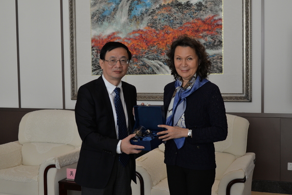 吴强向达丽雅·雅卢洛夫娜·哈布里耶娃一行的到来表示热烈欢迎,并详细介绍了培训基地建设情况、学科发展、师资力量等方面的概况。石其宝、王蔚、胡戎恩等也分别就各自专业领域内的研究成果进行了介绍,并同达丽雅·雅卢洛夫娜·哈布里耶娃、拉米尔·乌斯马诺维奇·哈布里耶夫、叶甫盖尼娅·叶甫盖尼耶夫娜·弗罗洛娃分别就近期双方可能合作的领域与方式进行了交流。