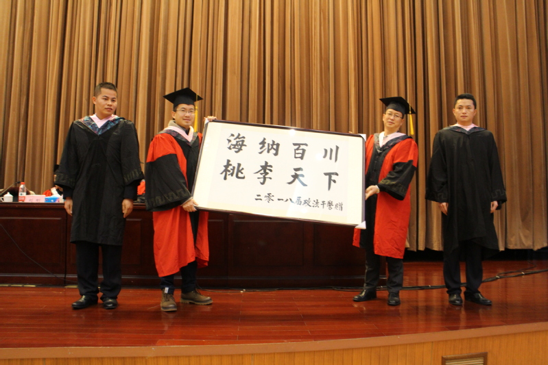 潘牧天为杨再坤等22位优秀毕业生颁发了荣誉证书,希望他们能将为人民服务由信仰转化成了肩上的责任,做一名优秀的人民警察。“人生结交在终始,莫为升沉中路分。”刘刚分别为高德江、催万鹏、兰舒婷、王春恒颁发了“校友大使”聘书,希望在座的各位毕业生同学珍惜师生情和同窗谊。