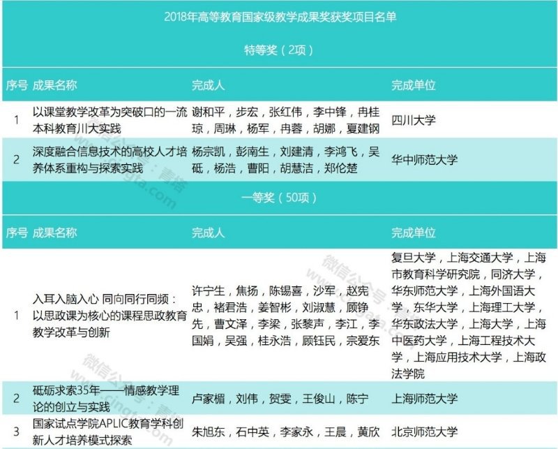 国家级教学成果奖是按照国务院《教学成果奖励条例》设立的教育教学研究和实践领域最高奖,每四年评审一次。用于奖励反映教育教学规律,具有独创性、新颖性、实用性,对提高教学水平和教育质量,实现培养目标,产生明显效果的教育教学集体和个人。本次高等教育国家级教学成果奖共有452项,其中:特等奖2项,一等奖50项,二等奖400项。