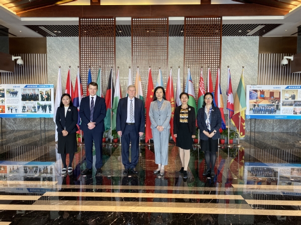 刘晓红对Chetver Tkov Andrey一行来访表示热烈欢迎,我校与莫斯科大学依托上海合作组织,将展开更加深入、前景广阔的合作,为中俄两国培养优秀的法律服务人才。Chetver Tkov Andrey对我方的介绍与热情接待表示感谢。他称赞了我校中国-上合基地对于两校合作的重大作用,欢迎我校学生前往莫斯科大学学习深造。双方互赠纪念品并合影留念。