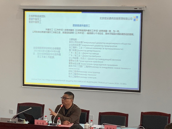 赵立国做了题为依法合规进入俄罗斯市场的讲座,介绍了在俄罗斯设立公司、组建团队、财务管理以及在俄罗斯执行工程类项目过程中需要注意的问题,详细地讲解了在俄罗斯申请引进和使用外国劳工的配额,优惠税收政策等。
