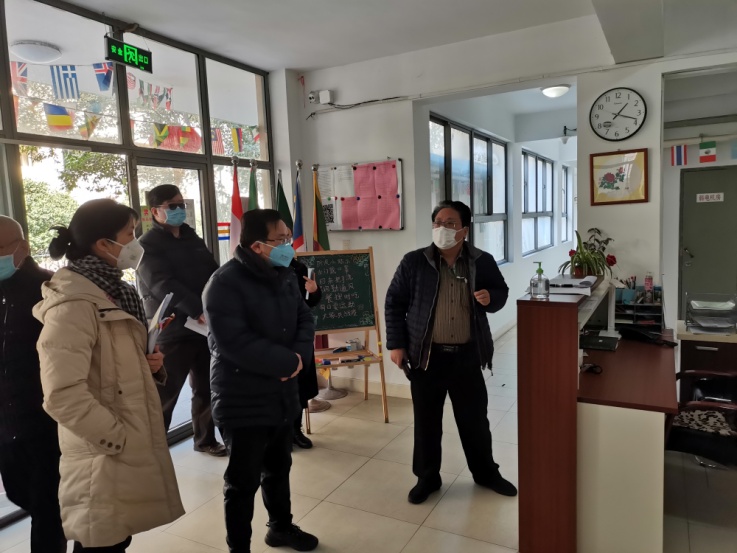 学校要闻 2月5日下午,市教卫党委副巡视员杨伟人、市教委国际交流处副调研员葛静怡赴我校检查指导疫情防控工作。校党委书记夏小和,党委常委、宣传部部长、党办校办主任高志刚,学校总值班、政府管理学院总支书记连淑芳,国际交流学院副院长、留学生办公室副主任周怡、后勤保障处副处长祝耀明、保卫处副处长陆嵬陪同检查。