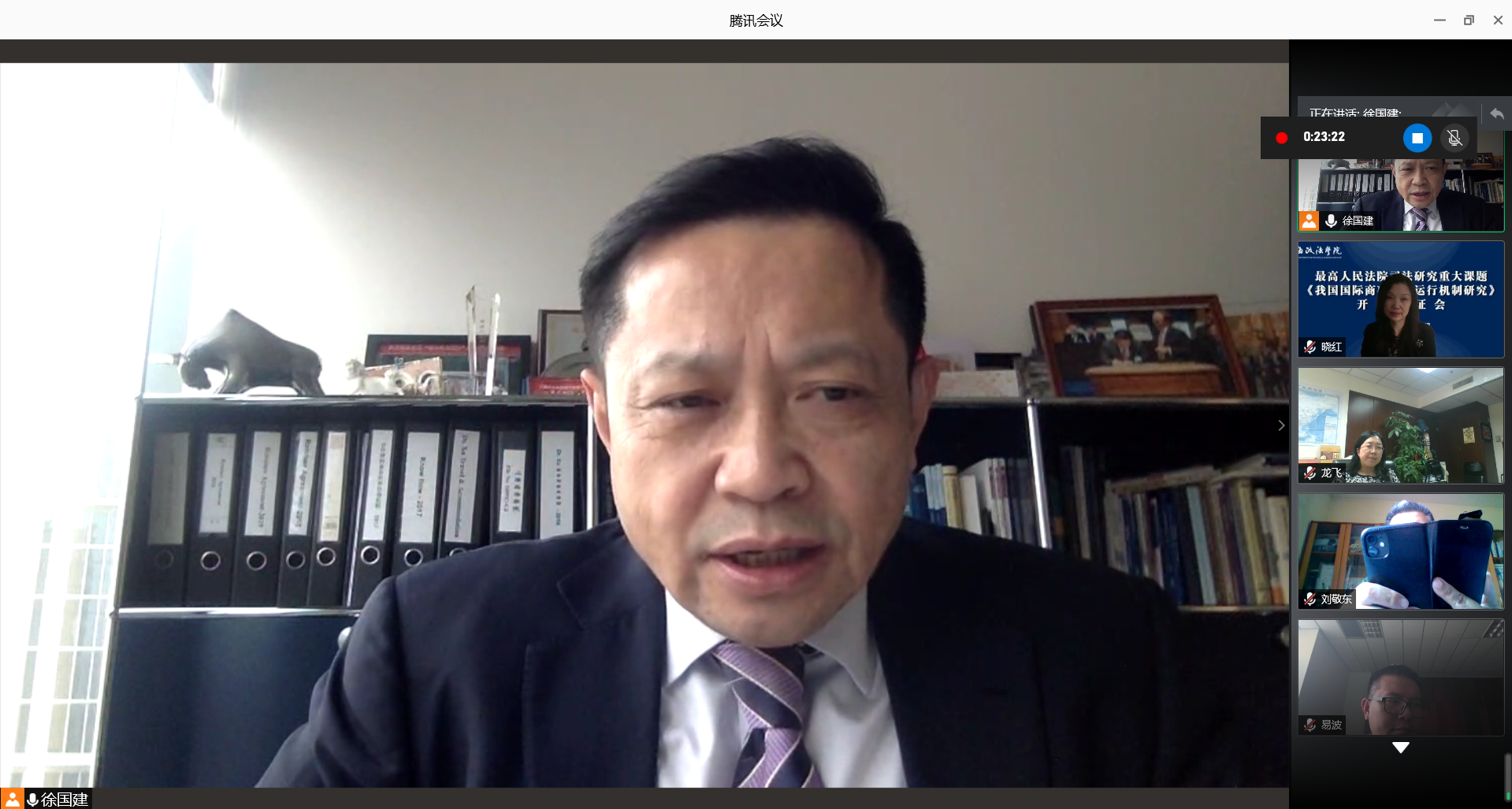 徐国建首先对与会专家学者表示欢迎与感谢,并就课题作了简要介绍。随后,刘晓红从课题的背景与意义、拟解决的问题与初步对策、课题研究思路、课题实施步骤等九个方面作了详尽的开题汇报,并表示希望在与会专家的指导下,进一步明确研究方向和研究思路,以期最终顺利完成课题目标,有效推动中国国际商事法庭在国际司法体系中的发展,为“一带一路”沿线国家的争端解决提供服务。