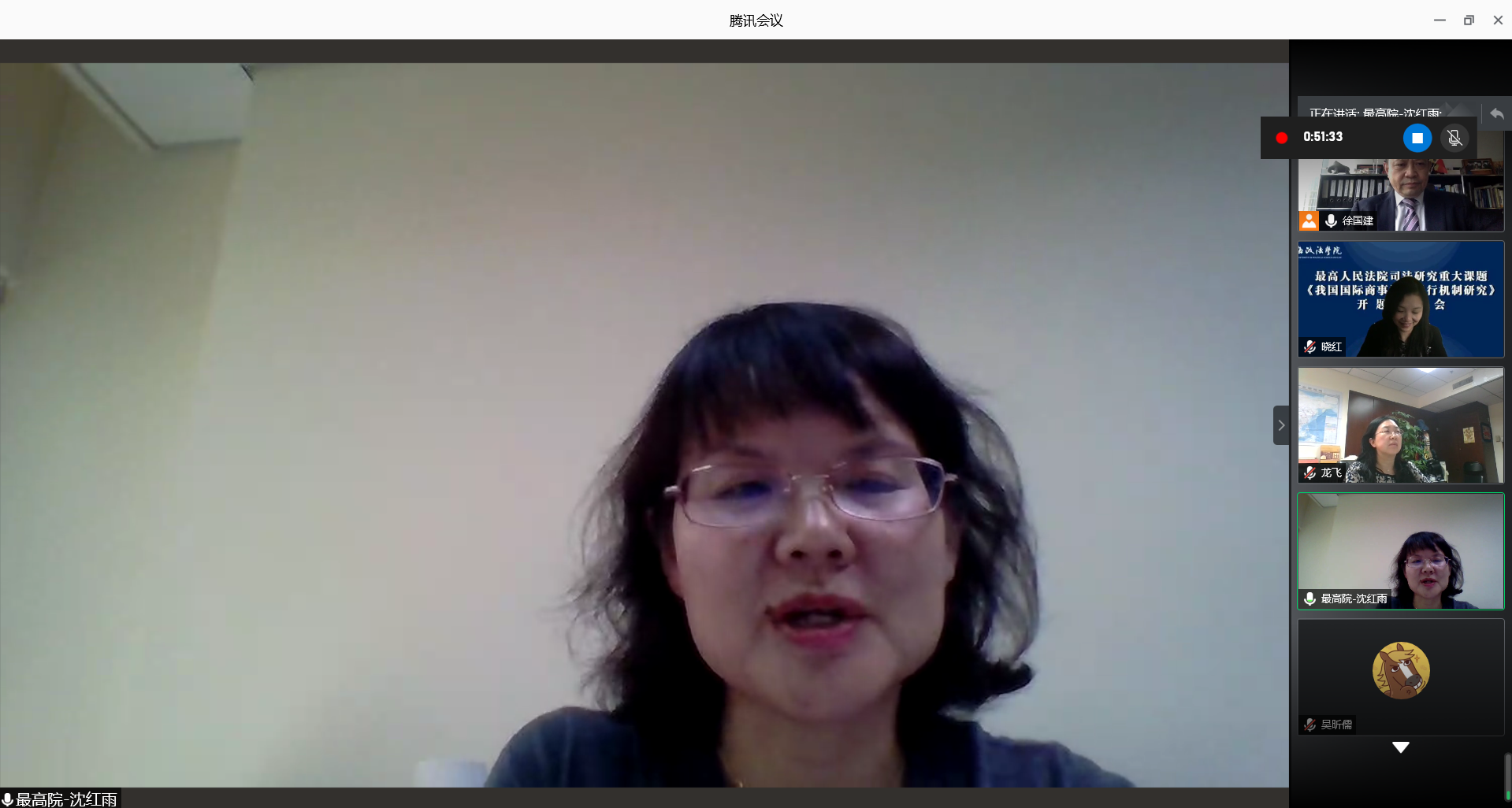 沈红雨表示,本次报告体系全面、逻辑严密,总结的三原则是报告的一大亮点,其对开题报告继续推进以及成果转化非常有信心。她建议,进一步凝练研究思路,在增强司法竞争力方面更多地择墨;同时,深入完善研究方法,可以借鉴国外研究得较为成功的国际商事法庭,进行比较研究。