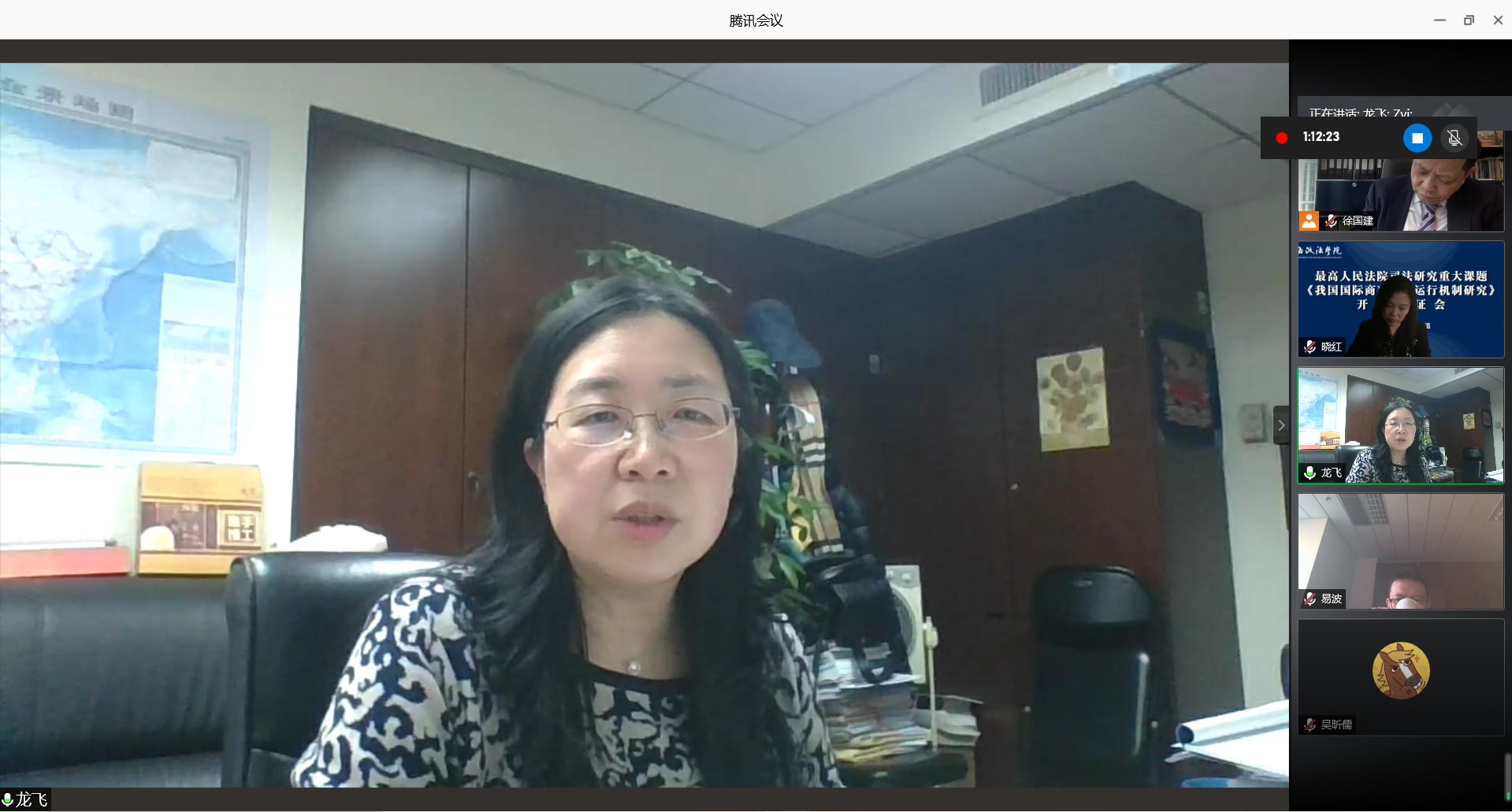 龙飞阐述了国际商事法庭运行机制所面临的困难和亟需解决的问题,为课题组的研究方向提供了更明确的指引。结合开题报告,她提出一些可深入研究的方面,涉及中国国际商事法庭整体的体系化建设,聘任香港非常任法官的可行性分析,“一站式”平台机制和域外法查明平台机制的具体方案,对课题组在这些方面形成最终成果表示期待。