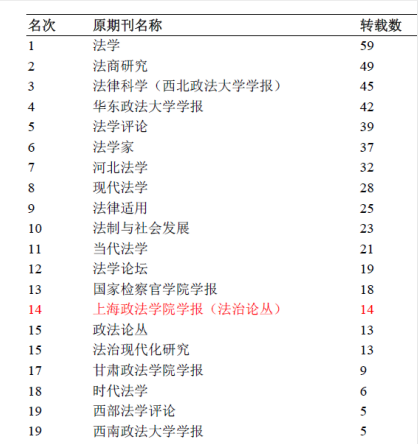 《检索报告》显示,我校学报2020年共被142条检索途径转载文章14篇,在全国法律类院校学报中排14 位。